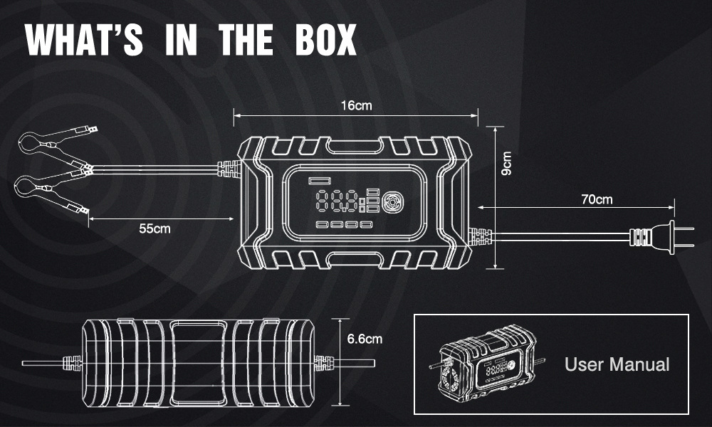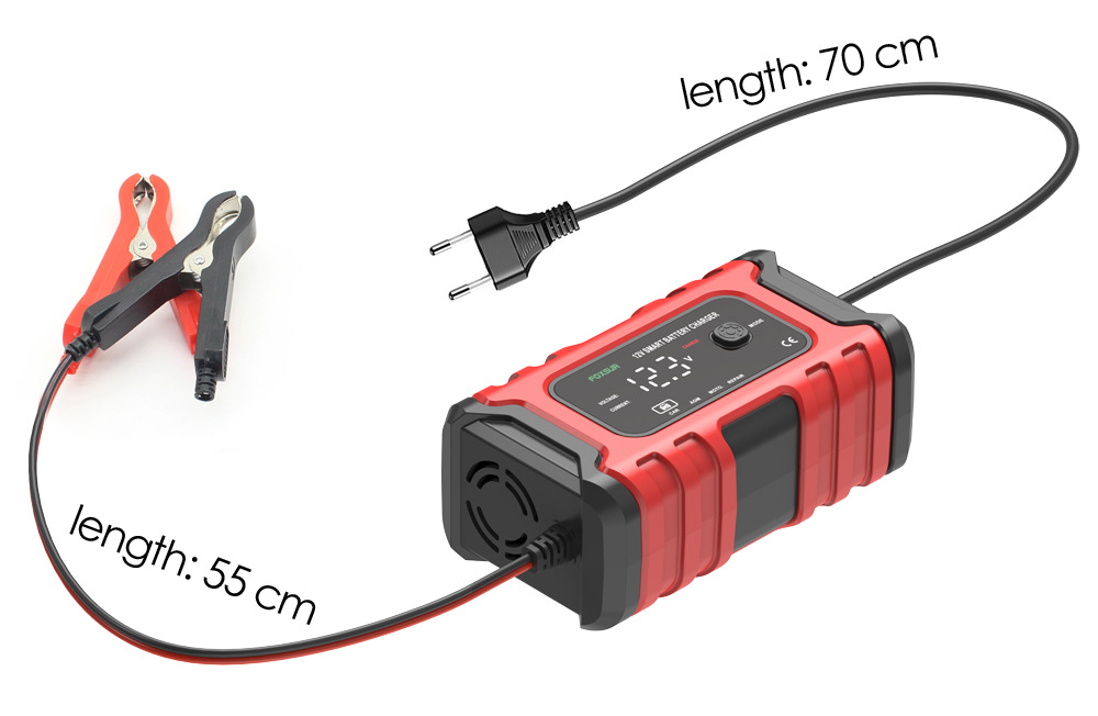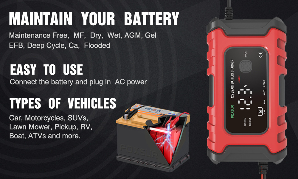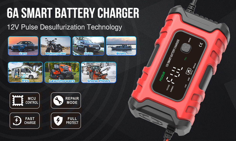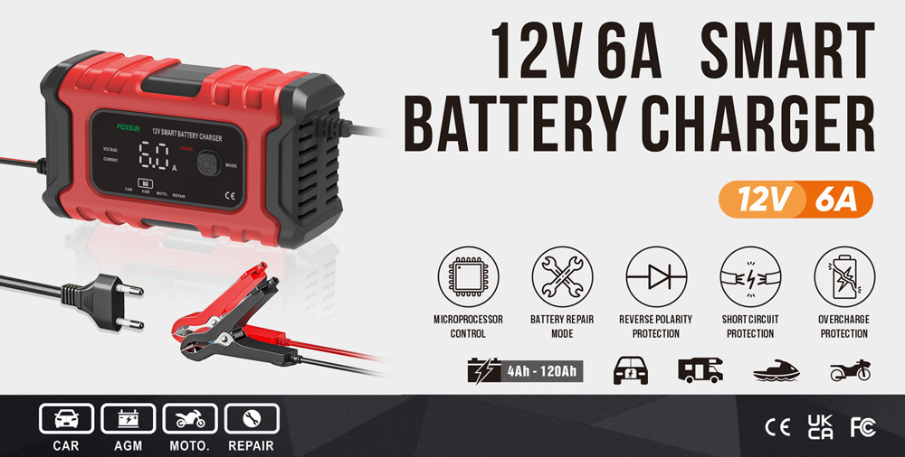 12V 6A Smart Battery Charger with LED Display, Motorcycle & Car Battery Charger 12V AGM GEL WET Lead Acid Battery Charger