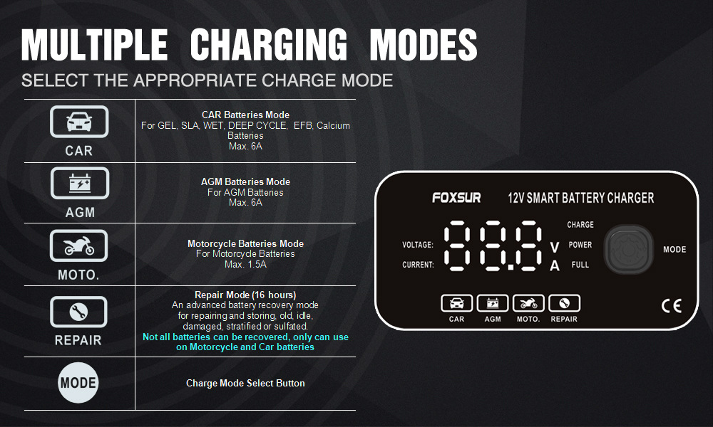 Types of batteries: Most types of lead acid batteries including Calcium, Gel AGM, Wet, lead Acid, etc..