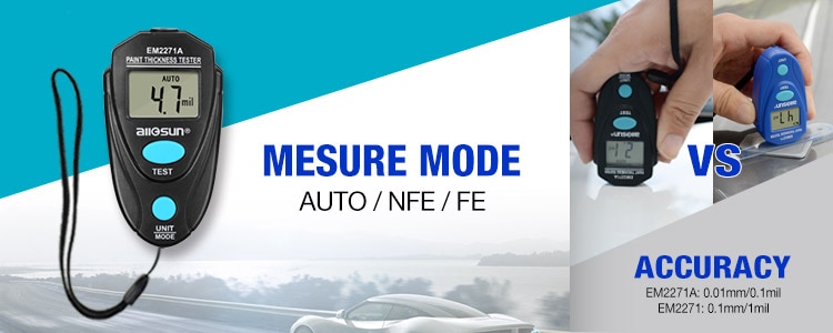 (refrigerator,oven,microwave oven,etc) 5.For measurements in AUTO test mode and on object with steel substrate ±(10% of reading + 0.10mm), most car is made of steel, and, if you get result of 0.00mm or 0.01mm , it is under normal condition,acceptable error, because most car paint thickness is 0.1-0.15mm. 6. There is not calibration plates in the parcel of EM2271. It doesn't need calibration. If you need, please contact us. 7 . Please press the probe vertical to the object, and make sure the object surface is smooth and clean. EM2271 Specifications: • Measurement range: 0.0 to 2.0 mm, 0 mil to 80 mil • Accuracy: 2%rdg +-0.1 mm, or 2%rdg+-4 mil • Resolution:0.1 mm/1 mil • Power supply: 1 x 3 V button cell, CR2032 or equivalent, • Measuring technology: Magnetic • Size :6.9 x 3.8 x 2 cm • Weight: About 23 grams (including button cell) How the device work 1. Probe Before measurement, place the tester with its probe firmly against target surface. 2. Display 3. "TEST" button (1). Press "TEST" button to turn on the tester. Press and hold down this button for about 1 second to turn off the tester. (2). Press "TEST" button to delete the reading on the display,the display will show "- -". 4. "UNIT" button Press this "UNIT" button to select desired unit: mm or mil ![]() ![]() ![]() ![]() |
