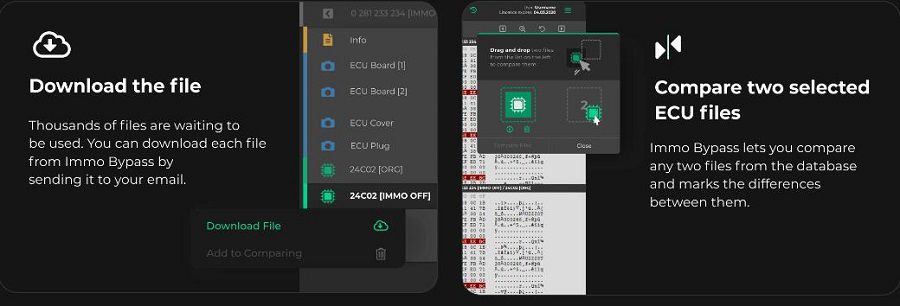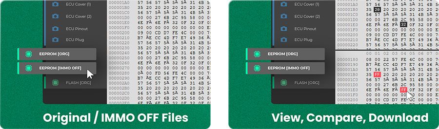 ECU files are the core of Immo Bypass. Each solution consists of files – original and modified dumps that can be downloaded and programmed into your ECU.