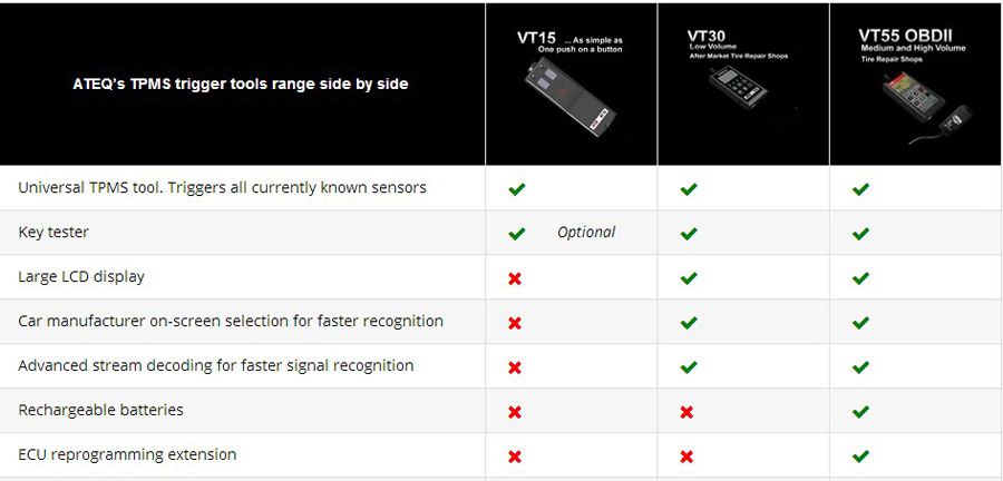 On top of the US manufactured vehicles, the ATEQ’s VT55 OBDII reprograms Asian or European vehicles (including Toyota, Honda, Nissan, Hyundai, Kia, Mitsubishi, etc) which do not feature a TPMS self reprogramming software.