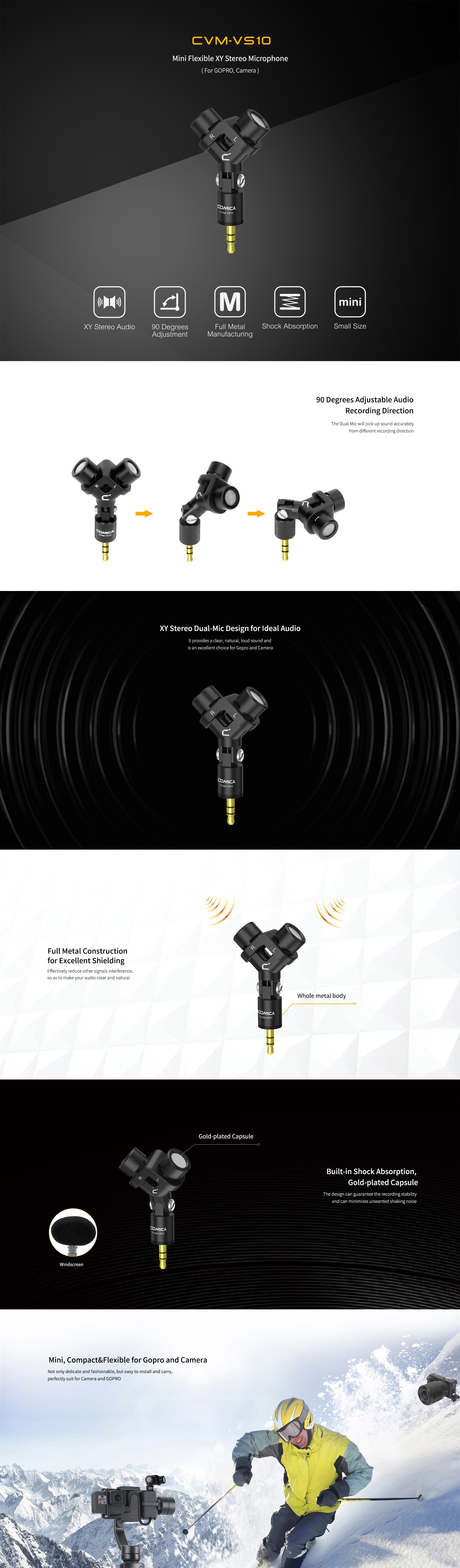 Comica CVM-VS10 is specially designed for GOPRO and Camera, is a XY Stereo microphone with dual-Mic design and super sound quality. Besides, VS10 not only comes with 90 degree audio recording direction adjustment, full metal construction for excellent shielding, but also designed with built-in shock absorption and gold-plated capsule, which is a mini but flexible microphone for GOPRO and camera.