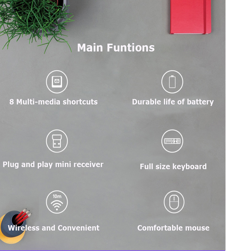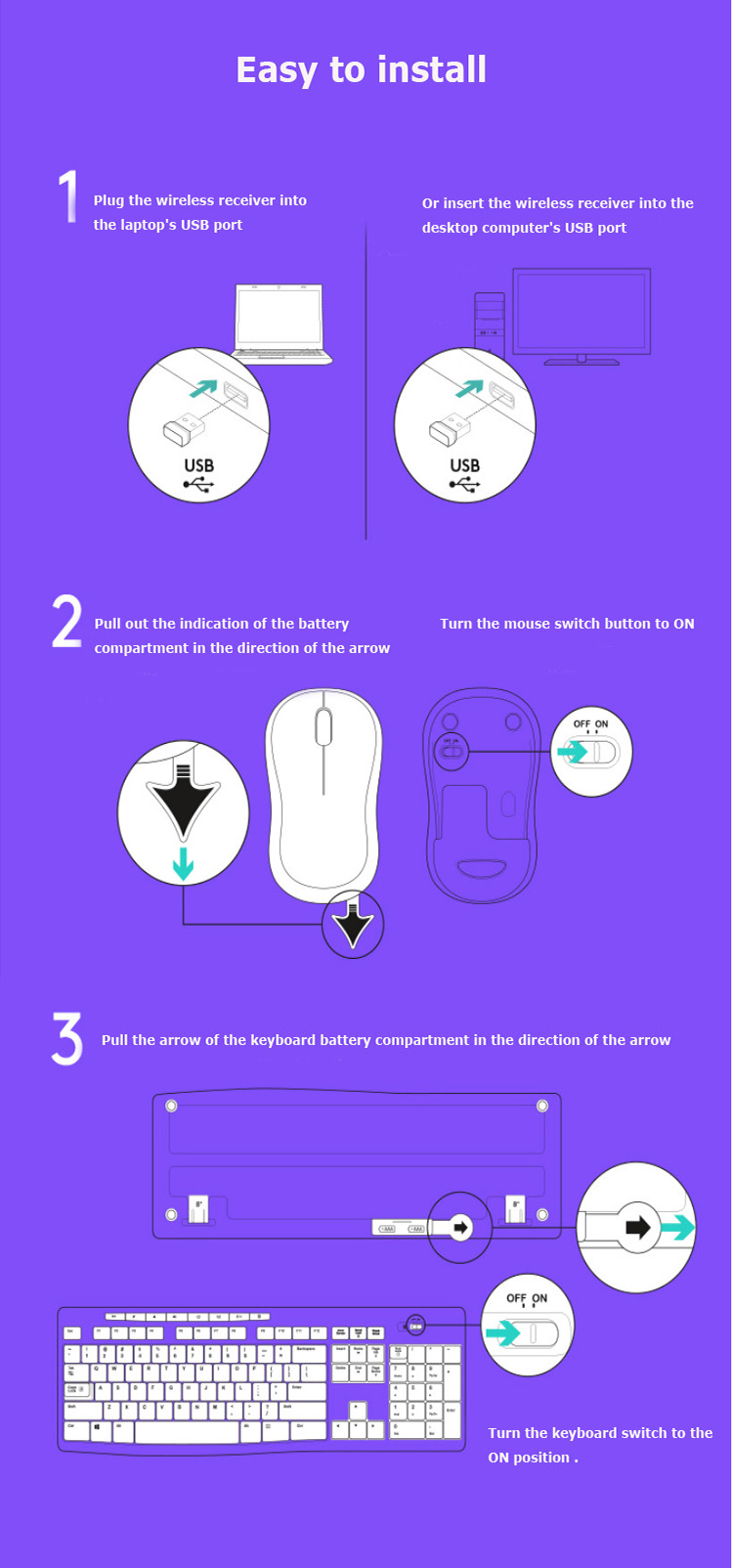 The keyboard has a battery life of up to 36 months and a mouse battery life of up to 12 months. With a power switch, you can stay away from battery replacement for months.