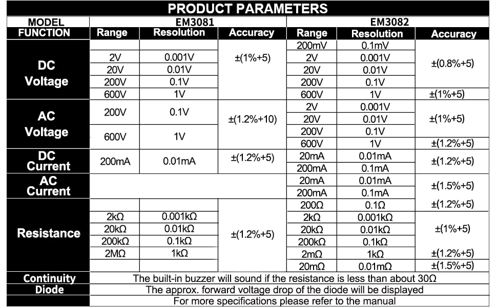 | Continuity | The built-in buzzer will sound if the resistance is less than about 30Ω | |||||