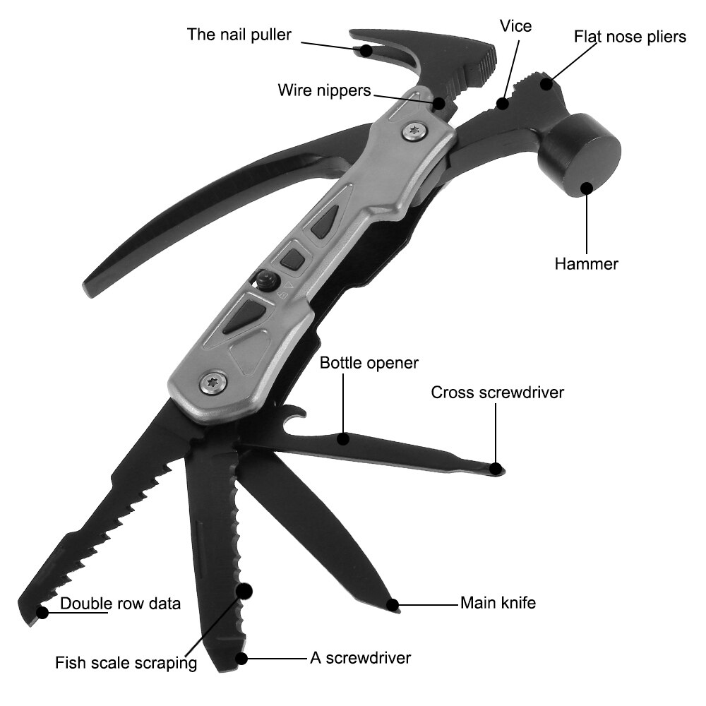 - All In One Tools: The multitool has mini hammer, nail picker, flat pliers, vise, wire cutter, knife, double row saw, serrated knife, file, flat-head screwdriver, Phillips screwdriver, bottle opener and so on.