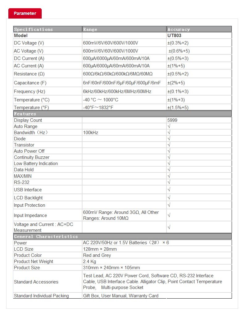 UNI-T UT803 LCD Display Bench Type Digital Multimeters