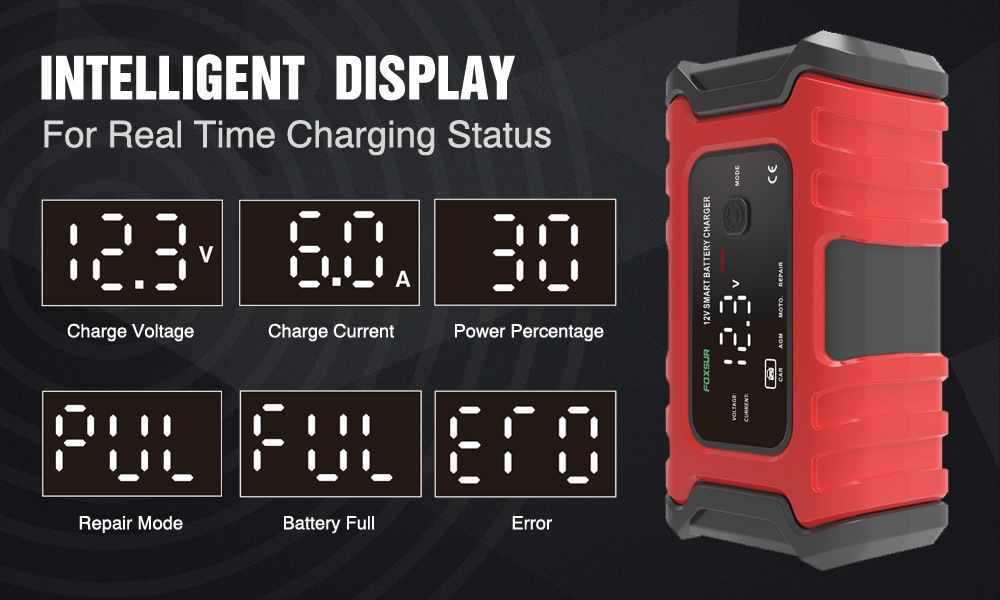 12V 6A Smart Battery Charger with LED Display, Motorcycle & Car Battery Charger 12V AGM GEL WET Lead Acid Battery Charger