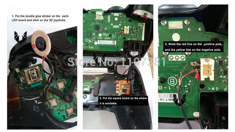 1.Put the double glue sticker on the each led broad and stick on the 3D joysticks.
