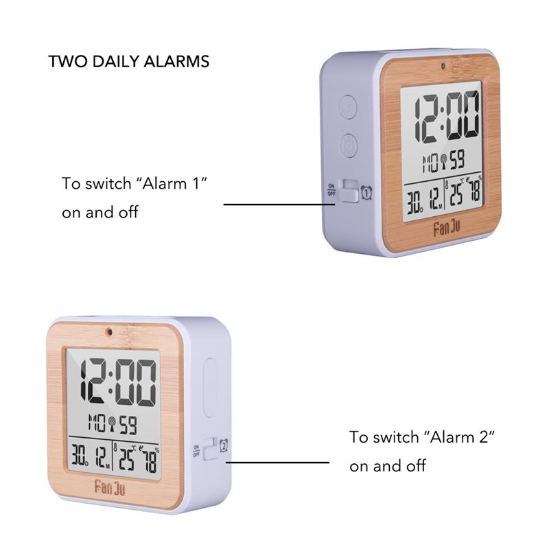 There are two alarms with simple on/off button on the left and right side respectively. You can simply switch alarm 1 or alarm 2 for waking-up service, never worry about oversleeping.