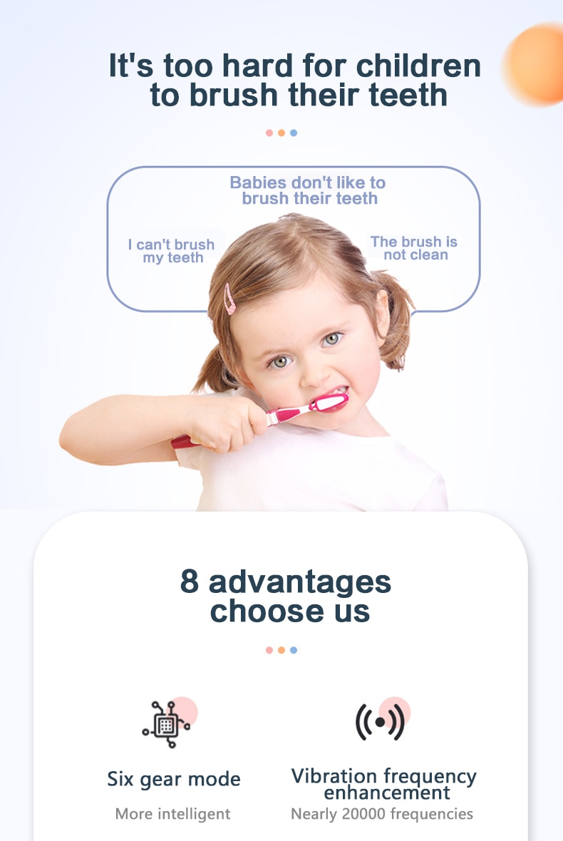 2.Kids Electric toothbrush applying U-type brush head design patented food-grade special soft silicone material, and 360° teeth-wrapping design, your toothbrush can massage your gums and each use will bring your mouth a fast and comfortable experience. Kids Electric.