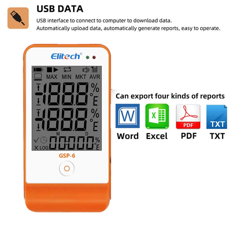 This data logger conforms to GSP standard of new edition. It has one big LCD screen,a button,an external temperature sensor and an external humidity sensor. With two modes to save data: full record stop and cyclic record,the data logger has the functions of over limit sound-light alarm. It can also automatically shorten the record interval in case of over temperature and humidity limit. Two pieces of built-in magnets are convenient to fix the data logger onto metal material surface.