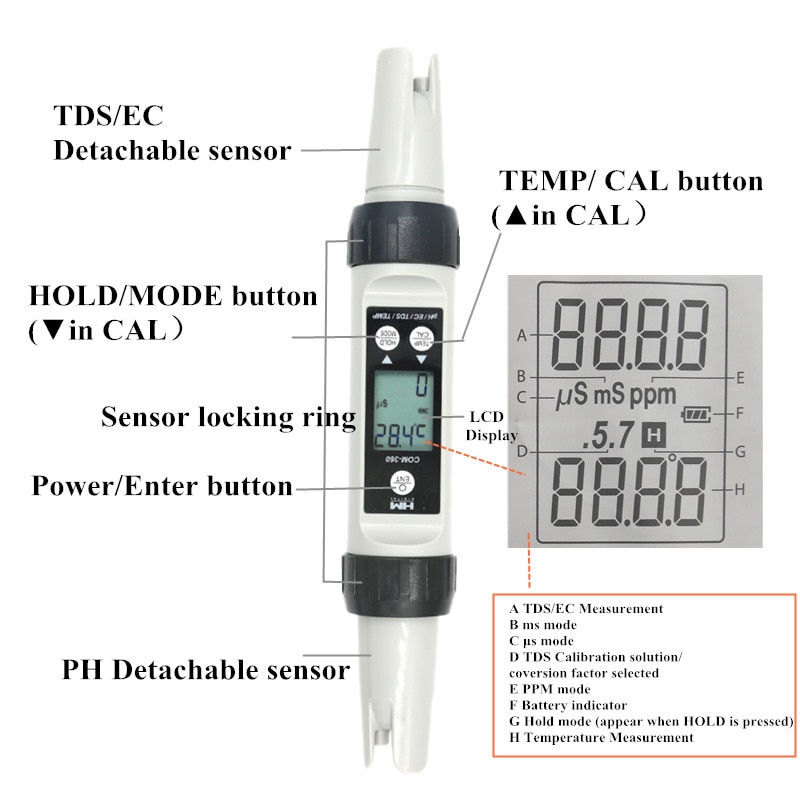 The COM-360 is an advanced waterproof combo meter with superior accuracy. The meter measures four parameters: pH, Electrical Conductivity (EC), Total Dissolved Solids (TDS) and temperature. EC-TO-TDS Conversion Factor: Pre-programmed, non-linear conversions for 0.5(Nacl)or 0.7(442 m)solutions, selected by the user, as well as selectable modes for measurements in the S, mS and ppm scales. The meter incorporates automatic temperature compensation (ATC) to accommodate for discrepancies in temperature that would naturally occur, and also features digital calibration for easy and precise calibration that will yield better results.