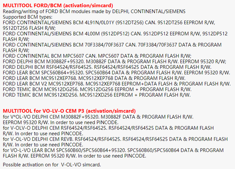 Reading/writing (64F7055, 64F7058, 64F7059 microcontrollers). FULL FLASH reading/writing; EEPROM reading/writing (usually). All operations are done via K-LINE or CAN by OBD or wired on the bench without opening the ECU. On some ECUs there are some extra functions like odo-meter calibration, pincode extraction and reset (virgin). Also software has FLASH memory CRC calculator.