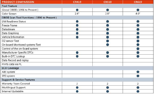 THE FEATURES YOU NEED: 2.8"Color LCD display; View freeze frame data; View graphical and numeric data streams; Sensor tests; Monitored systems tests;No batteries, power supply through OBDII cable.THOUGHTFUL DESIGN: All-in-one screen and easy-to-use hotkeys make the CReader 519 an ideal tool for the DIYer and professional technicians alike.