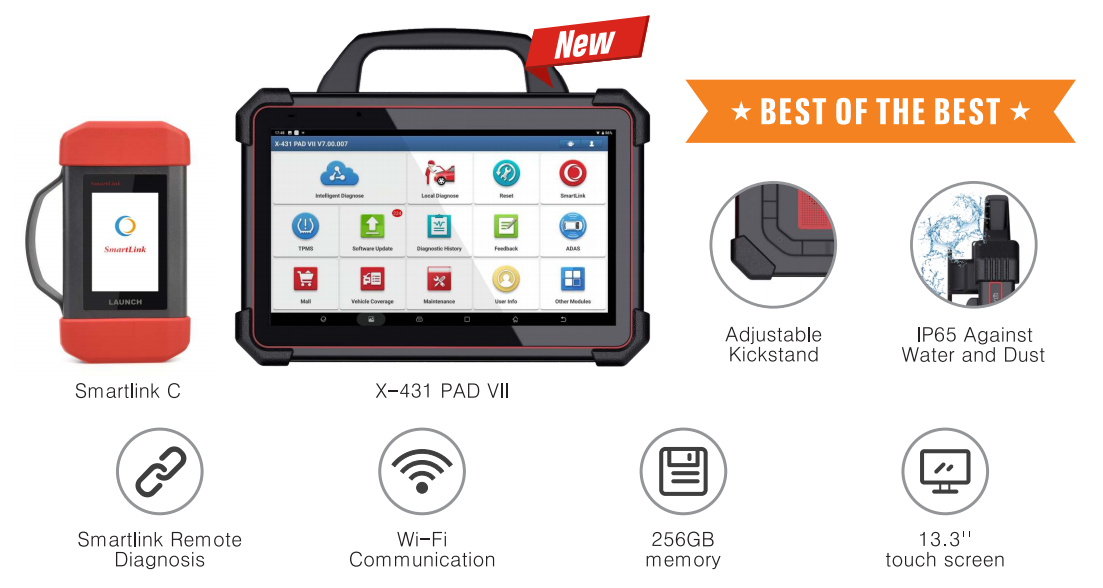 Launch X431 PAD VII is an unexpected high-end diagnostic, comes with a 13.3 inch large touch screen, 32 service functions and Smartlink remote diagnosis. Equipped with the 2.0GHz Octa-core optimized chipset, Android 9.0 operating system, 8G memory and 256G large storagememories, X- 431 PAD VII makes your intelligent diagnosis faster than ever. The precision-machined outer shell is designed to work against workshop hazards such as water and dust damage and in compliance with IP65.