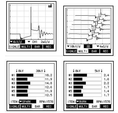 There are six testing channels that can test the secondary ignition of the six cylinders at the same time.