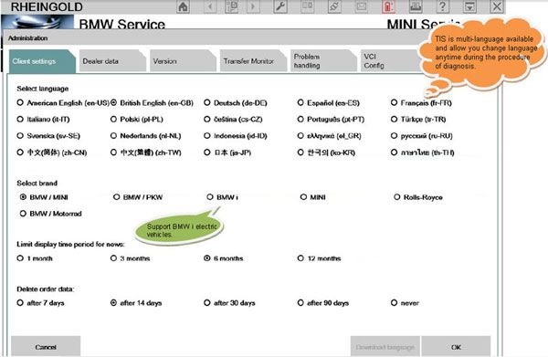 1) Enter the BMW icom software, you will see this interface, click the icon which appearance is wrench, then you will see the other language: