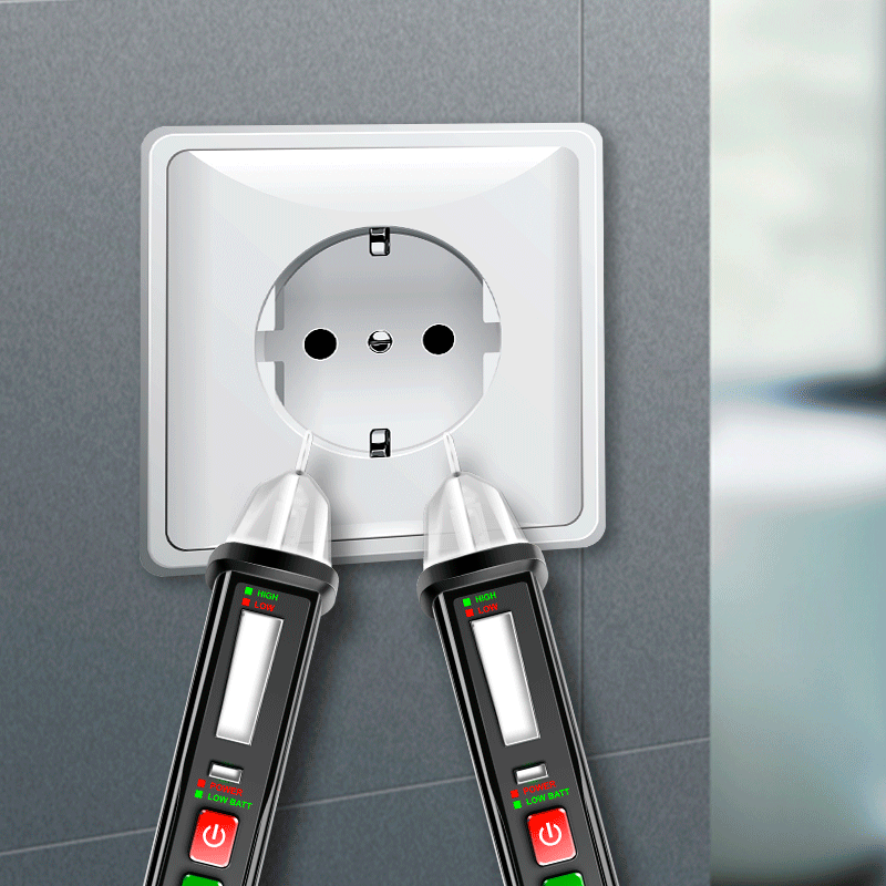 Insert the probe of the tester into power socket or get close to the live wire,when the tester defects AC voltage signal ,the induced voltage signal indicator flashes, according to the detected signal indicator flashes, according to the detected signal strength ,the signal strength indicator will show three kinds of color,green, green + red or red, meanwhile the buzzer makes alarming sounds of different frequencies: