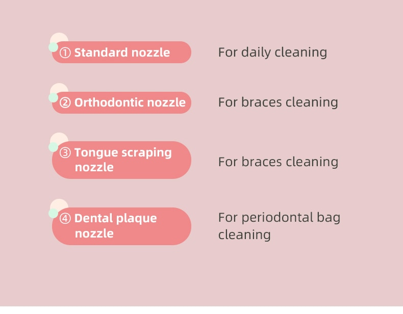 4 * Nozzles: Standard nozzles x2, Orthodontic nozzle x1, Tongue scraping nozzle x1, Dental plaque nozzle x1