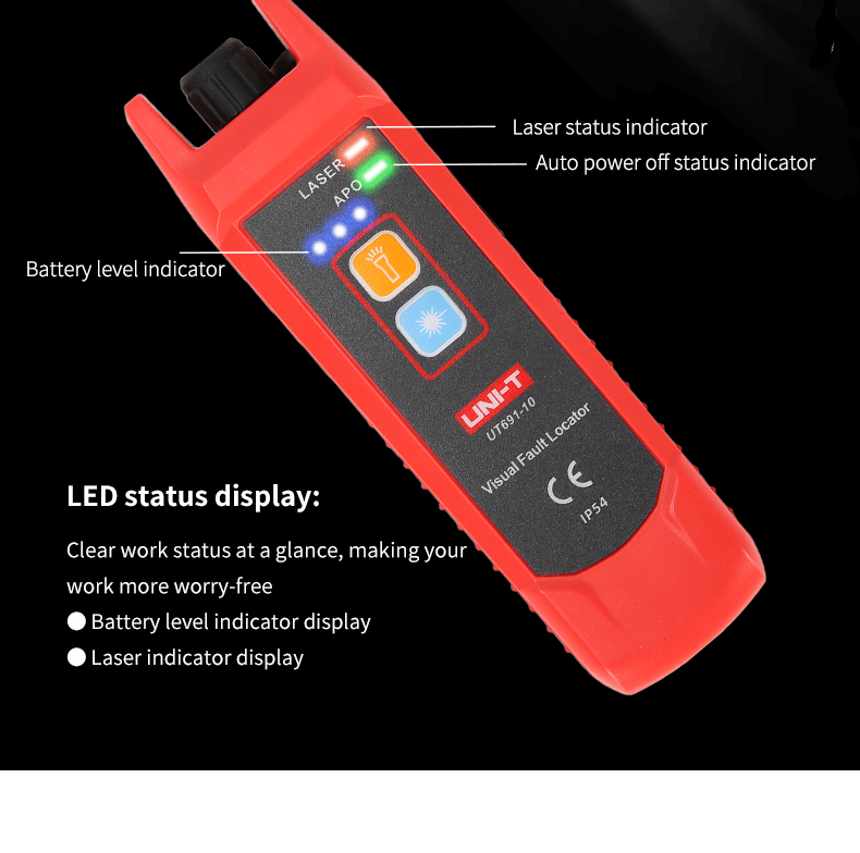 UT691 visual fault locator is designed for optical fiber fault detection and locating, end to endoptical fiber identification and more. It is IP54 rated, uses 650nm visible redlight with 2emitting modes of continuous or pulse. With the functions of APO, battery statusindicator and flashlight, it can be widely used in the fields of optical cable constructionand maintenance, optical fiber communication or sensing, optical CATV and so on.